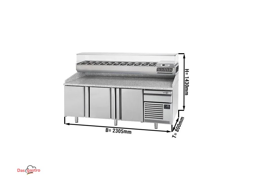 Commercial Refrigerated Pizza Prep Counter Premium PLUS - 2305x800 - 3 Doors - Top Display Rail - 11x GN 1/4