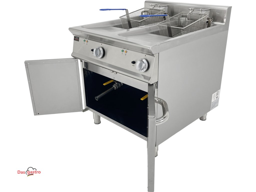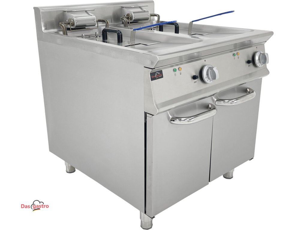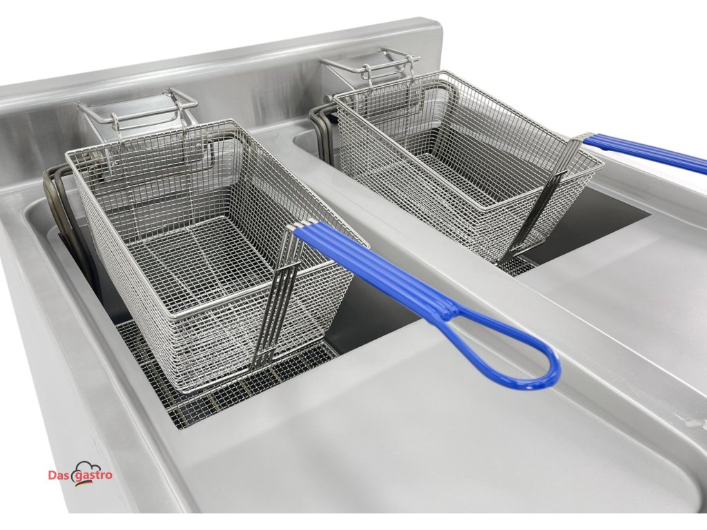 Dvounádobová elektrická fritéza se skříní je profesionální zařízení určené pro gastro provozy s vysokou kapacitou – restaurace, jídelny, bistra, fast foody či provozy rychlé obsluhy. Umožňuje současné fritování dvou různých druhů pokrmů bez promíchání chutí a díky dvěma samostatným nádržím výrazně zvyšuje průchodnost kuchyně.