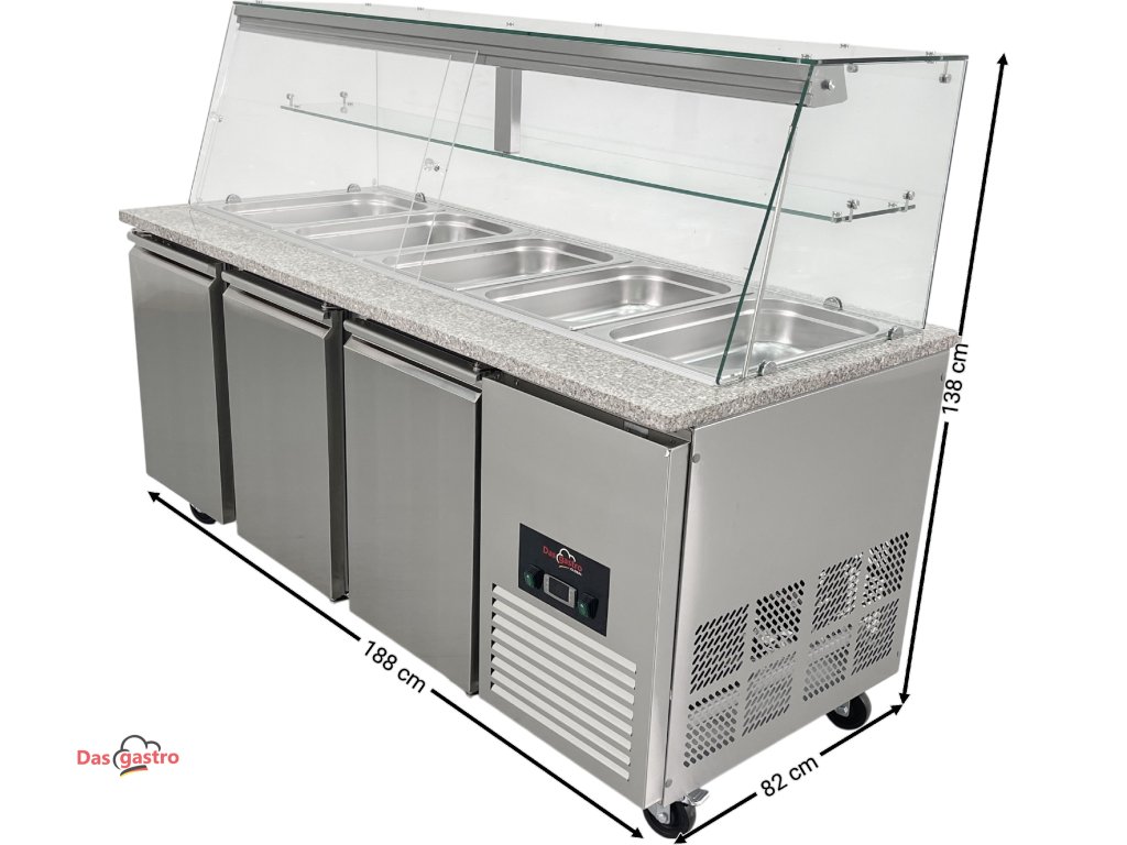 Refrigerated table designed for kebab vendors and other gastro businesses. The upper part is equipped to accommodate 5 GN 1/1 containers , where the dishes are clearly displayed under a glass top with integrated lighting. The lower part offers a refrigerated storage space with the possibility of direct insertion of GN containers.