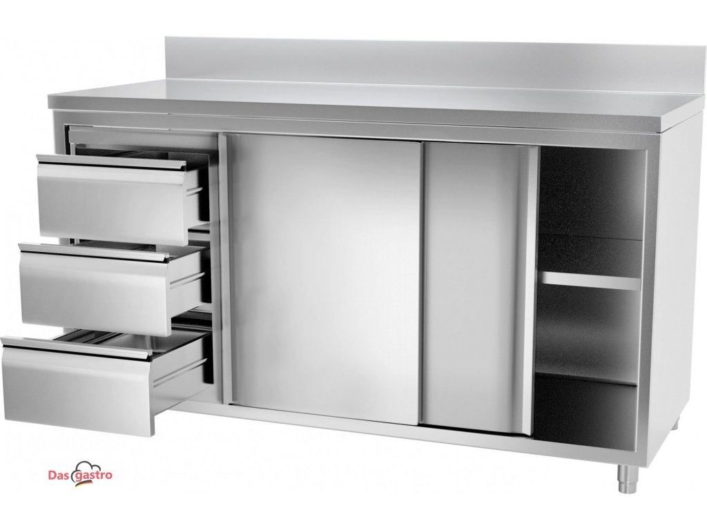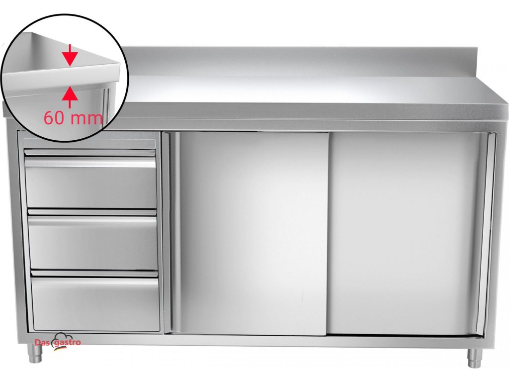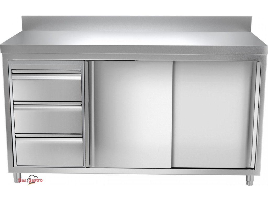 Pracovní skříňka PREMIUM z nerezové oceli - 1,6 m - se 3 šuplíky & obkladovým panelem