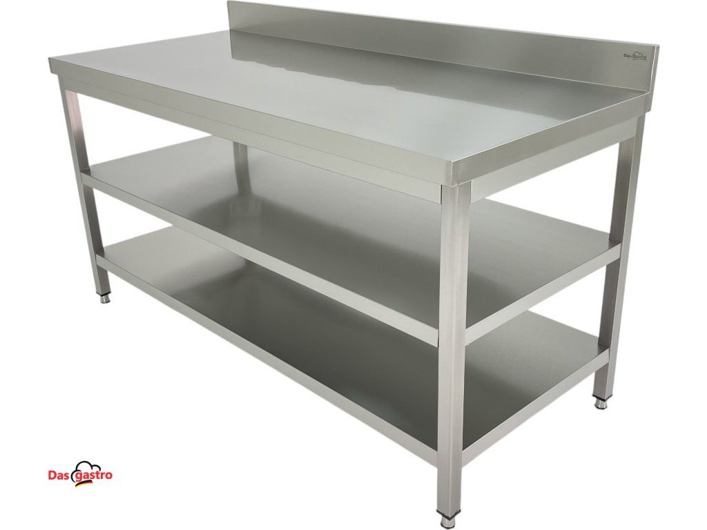 Nerezový pracovní stůl PREMIUM se dvěma policemi a zadním lemem 1,6 m