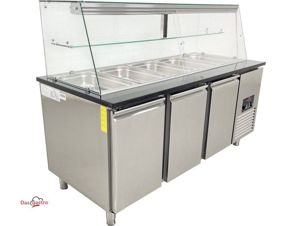 Stół bufetowy chłodniczy przeznaczony do prezentacji i serwowania gotowych posiłków w lokalach gastronomicznych, stołówkach lub hotelowych bufetach. Górna część jest wyposażona w miejsce na 5 pojemników GN 1/1 , gdzie potrawy są wyraźnie eksponowane pod szklanym blatem ze zintegrowanym oświetleniem. Dolna część oferuje chłodzoną przestrzeń magazynową z możliwością bezpośredniego wstawiania pojemników GN.