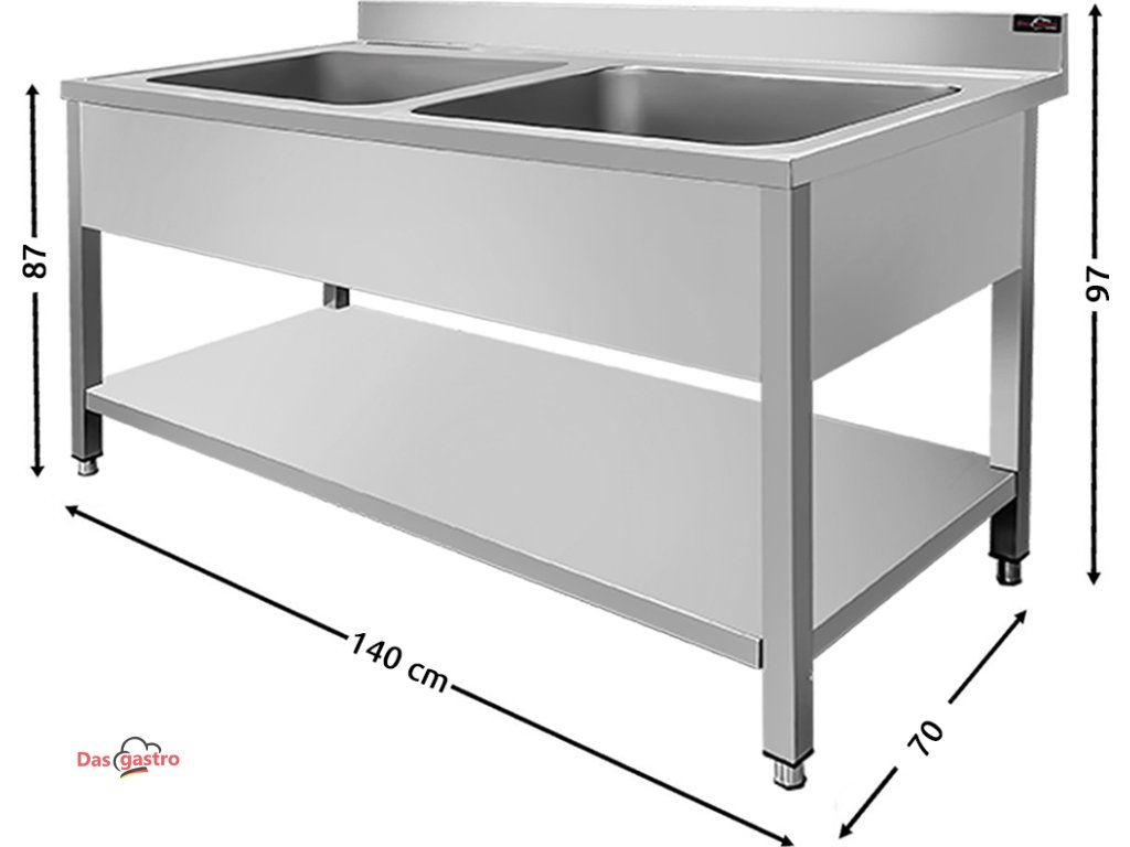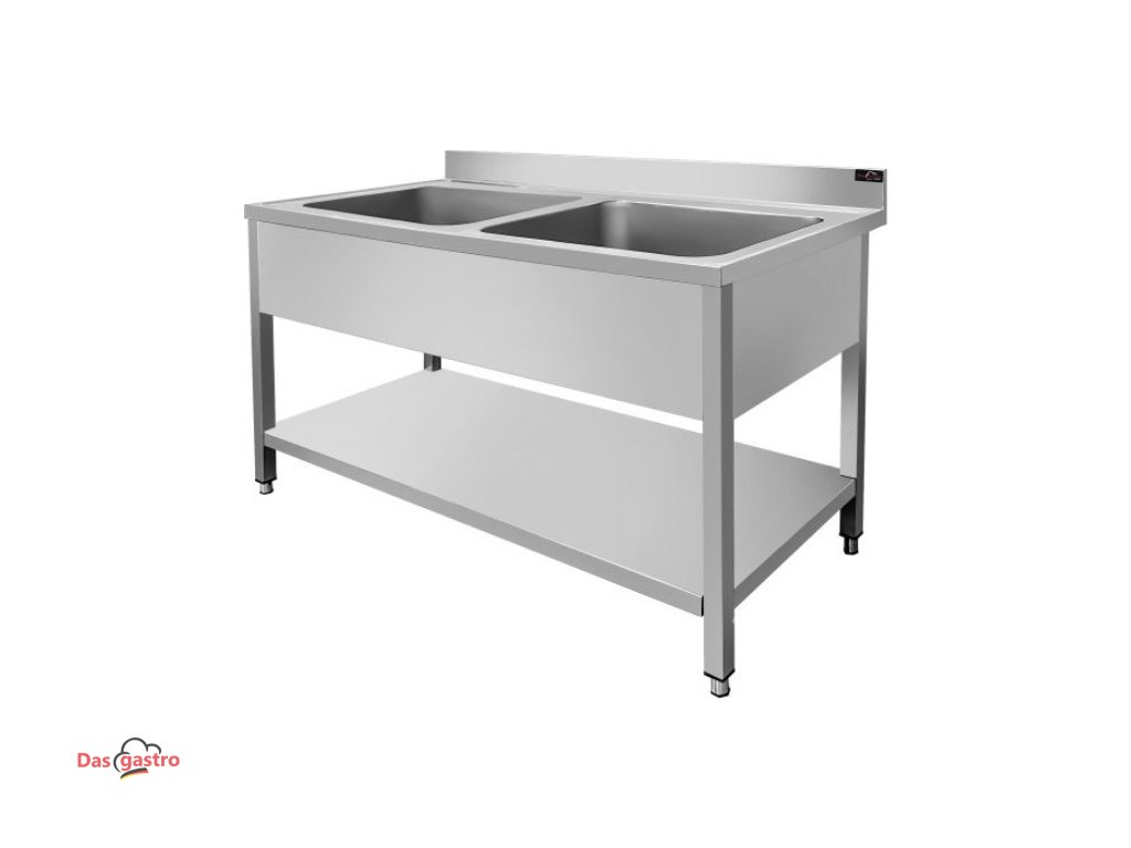 Zlewozmywak ze stali nierdzewnej PREMIUM z dwoma komorami pośrodku, dolną półką i tylną krawędzią o długości 1,4 m