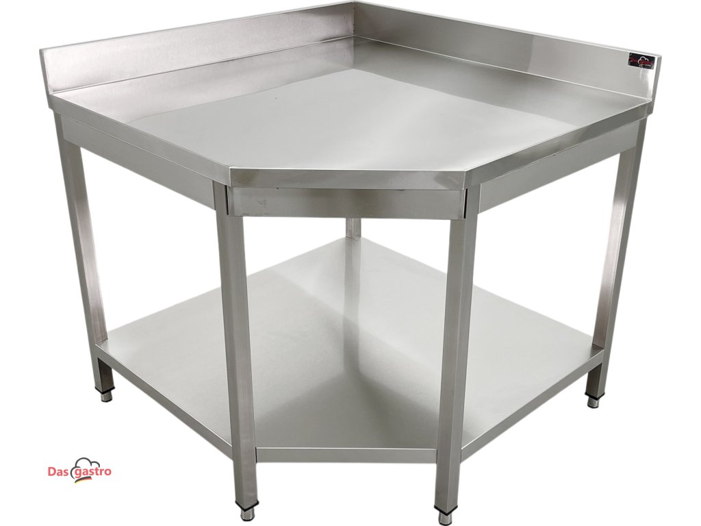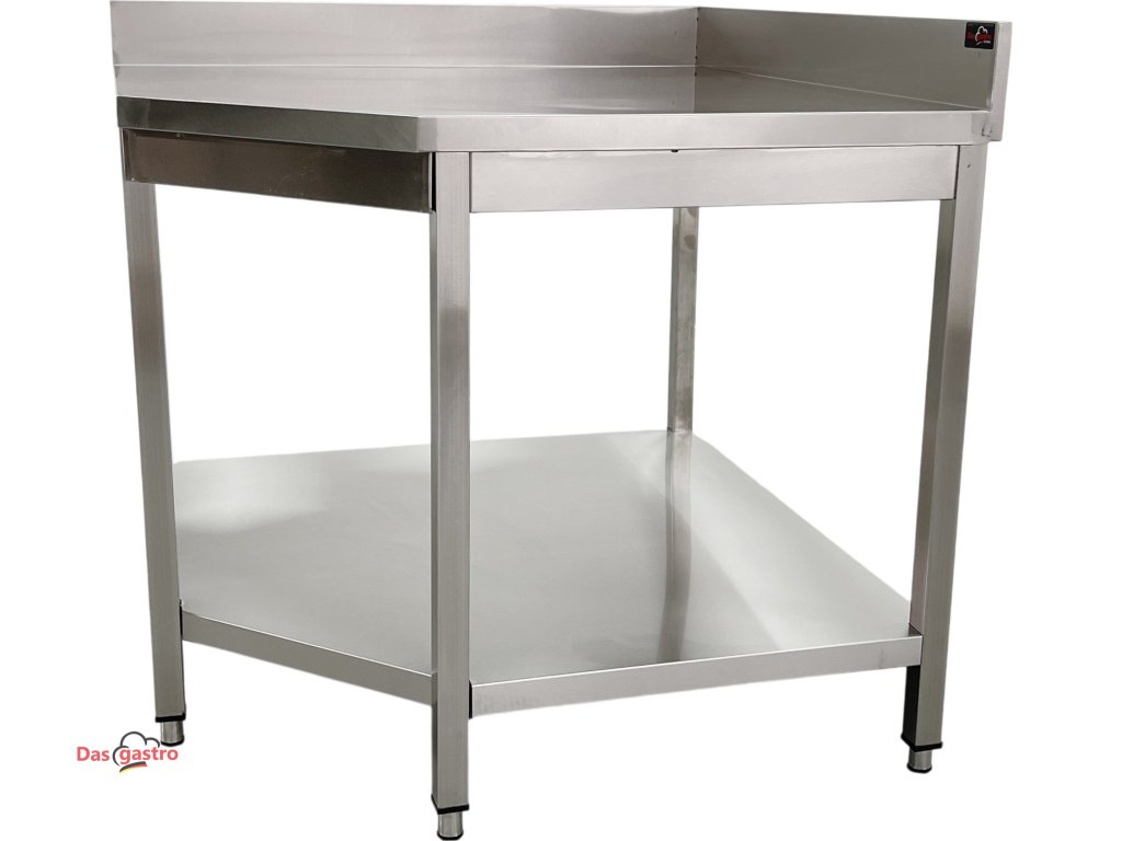 Narożny stół roboczy ze stali nierdzewnej o szerokości 700 mm z dolną półką i tylną listwą wykończeniową