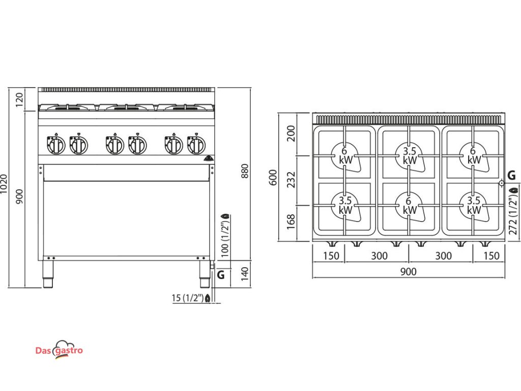 Plynový sporák - 28,5kW - 6 hořáků