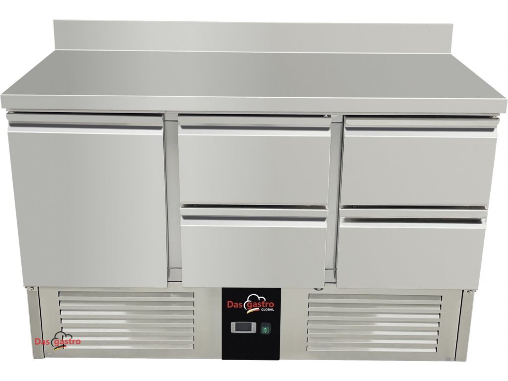 Chladiaci stôl / prípravný stôl 1,37 mx 0,7 m - s 1 dverami a 4 šuplíkmi v pravo a zadným lemom