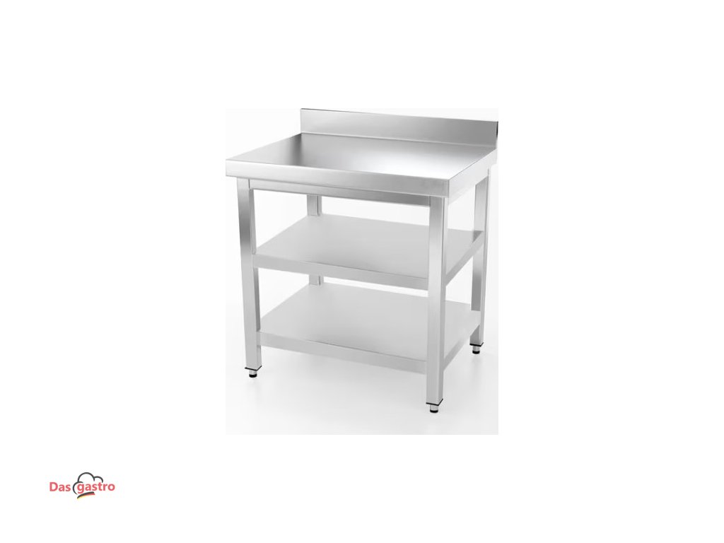 Nerezový pracovný stôl PREMIUM s dvoma policami a zadným lemom 0,6 m