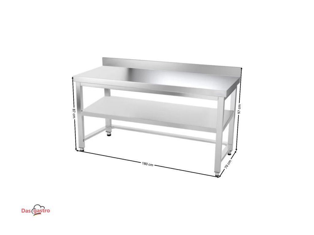 Nerezový pracovný stôl PREMIUM so spodnou policou, zadným lemom a trnožou 1,8 m